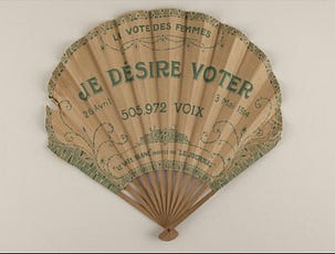 Distribué le 26 avril 1914 par Le Journal et différents mouvements suffragistes lors d’un référendum « sauvage » organisé en marge des élections législatives, l’éventail invitait les femmes à s’exprimer sur le droit de vote. À la question « Mesdames, Mesdemoiselles, désirez-vous voter un jour ? », 505 972 bulletins « je désire voter » sont comptabilisés, contre 114 votes négatifs. (Source : Gallica)